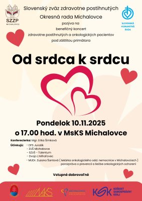 Slovenský zväz zdravotne postihnutých Okresná rada Michalovce vás pozýva na benefičný koncert zdravotne postihnutých a onkologických pacientov pod záštitou primátora mesta Michalovce.
