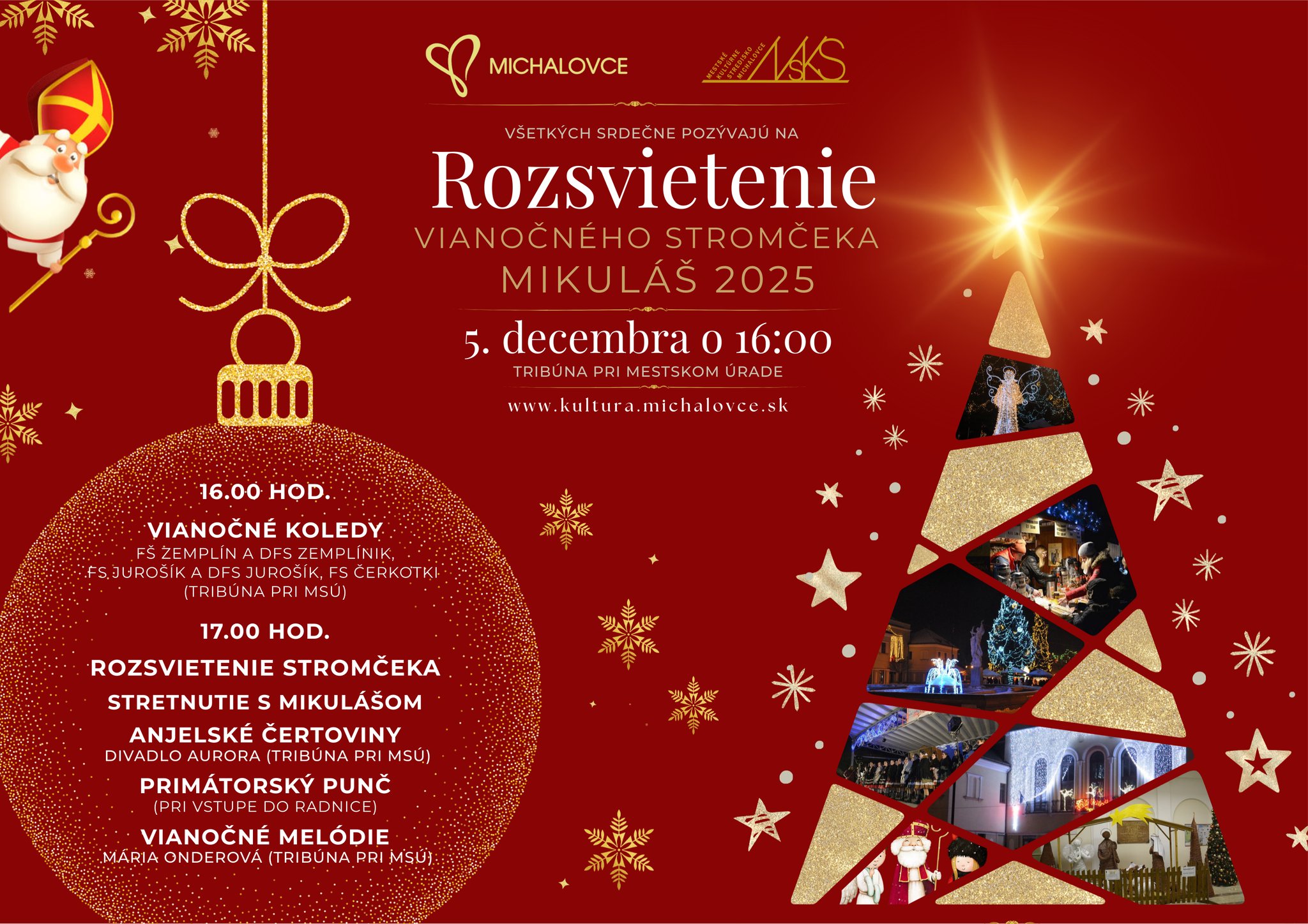 Rozsvietenie vianočného stromčeka v Michalovciach autor: Ondrej on 27. novembra 202527. novembra 2025 Príďte spolu s nami privítať Mikuláša, užiť si koledy a spoločne odpočítať rozsvietenie nášho vianočného stromčeka. Continue Reading Minulý Uplynulo 81 rokov od oslobodenia MichaloviecNasledujúci Michalovce sa zahalia do vianočnej atmosféry: Čakajú nás tradičné trhy, príchod Mikuláša aj benefičný punč